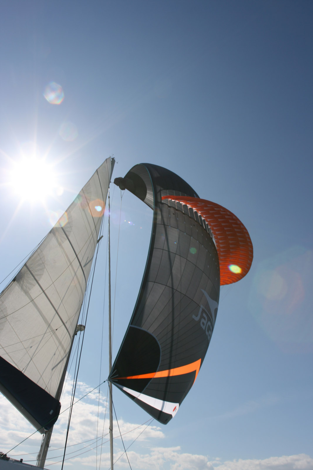 « Depuis une dizaine d’années, vous avez sûrement remarqué – avec étonnement peut-être – cette voile de portant sur les plans d’eau. Les tuyères et l’aile flottante sur l’extrados procurent au Parasailor un look facilement identifiable. Cette voile, apparue en 2009, s’est taillé la réputation d’un spinnaker symétrique dont la forme est maintenue grâce à son aile intégrée. C’est avant tout une voile de croisière pour équipage réduit qui privilégie la sécurité grâce à sa grande stabilité. Ses qualités ont permis à l’équipage d’un Fountaine Pajot Salina 48 de remporter l’édition 2015 de l’ARC devant des Outremer ou autre Neel 45, bien plus performants sur le papier. La tuyère sert de soupape dans les rafales, vidant la voile de la pression, et l’aile évite au guidant tout comme à la chute de décrocher trop facilement. Ces particularités ont permis à notre équipage test de garder le spi 90 % du temps de navigation, battant aussi au passage le record de vitesse du catamaran à plus de 24 nœuds. Pour cette occasion, le spi était surdimensionné pour être porté plus longtemps, et donc booster les performances. Avec sa taille standard de 170 m² pour un 47 pieds, les risques d’explosion sont quasi inexistants, même avec trente nœuds dans les surventes. En dix années d’exploitation, nous n’avons pas eu à déplorer de casse sévère. Le tissu, un nylon double rip-stop d’un poids de 44 g/m² jusqu’à 220 m² de taille et de 70–75 g/m² au-delà, est de qualité aéronautique. Sur les derniers modèles, les points d’écoutes ont été renforcés. Avec la tuyère qui atténue les tensions et maintient le spi vers le haut, la coque sous le vent s’en trouve soulagée et les risques d’enfournement par fort vent sont considérablement amoindris. Selon l’usage que l’on veut faire, il est possible de choisir une longueur de chute de plus ou moins un mètre entre le point de drisse et le niveau du pont. La plupart des clients ont opté pour une tranquillité et un confort de navigation avec une petite taille, mais la nouvelle génération est optimisée pour marcher aussi dans le tout petit temps, à partir de deux-trois nœuds. La taille de l’aile a été réduite, ce qui facilite l’envoi et l’étouffement avec la chaussette Easysnuffer. Sa forme, plus cambrée avec des volets de soupape, assure une plus grande réactivité grâce à un écoulement des particules d’air plus fluide. Cette nouvelle génération autorise des remontées jusqu’à 70° du vent apparent et une descente jusqu’au plein vent arrière à 180°. La plage d’utilisation est donc très grande. Comme cette voile corrige les petits écarts en se regonflant sans avoir à intervenir sur les écoutes, le pilote automatique pourra être sollicité fréquemment, et s’il est réglé en mode vent, il se peut que vous n’ayez pas à intervenir sur de longs bords. »