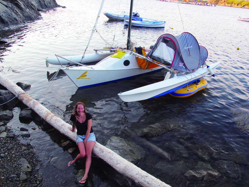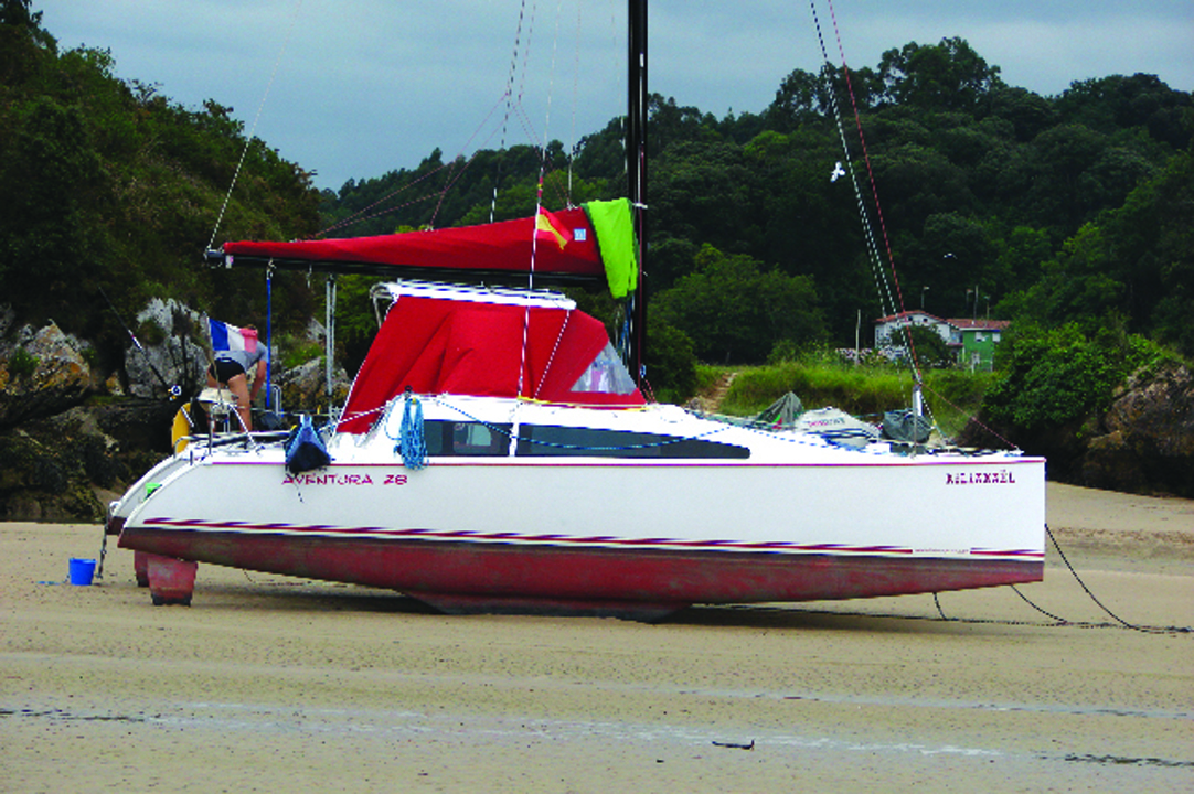 Le dièdre de la plupart des petits trimarans les soumet à l’échouage – comme au mouillage pour certains – à une certaine gîte, voire au risque de basculer d’un bord sur l’autre suivant la charge. Une annexe gonflée ou des engins flottants glissés sous un des flotteurs permettent de régler ce problème.