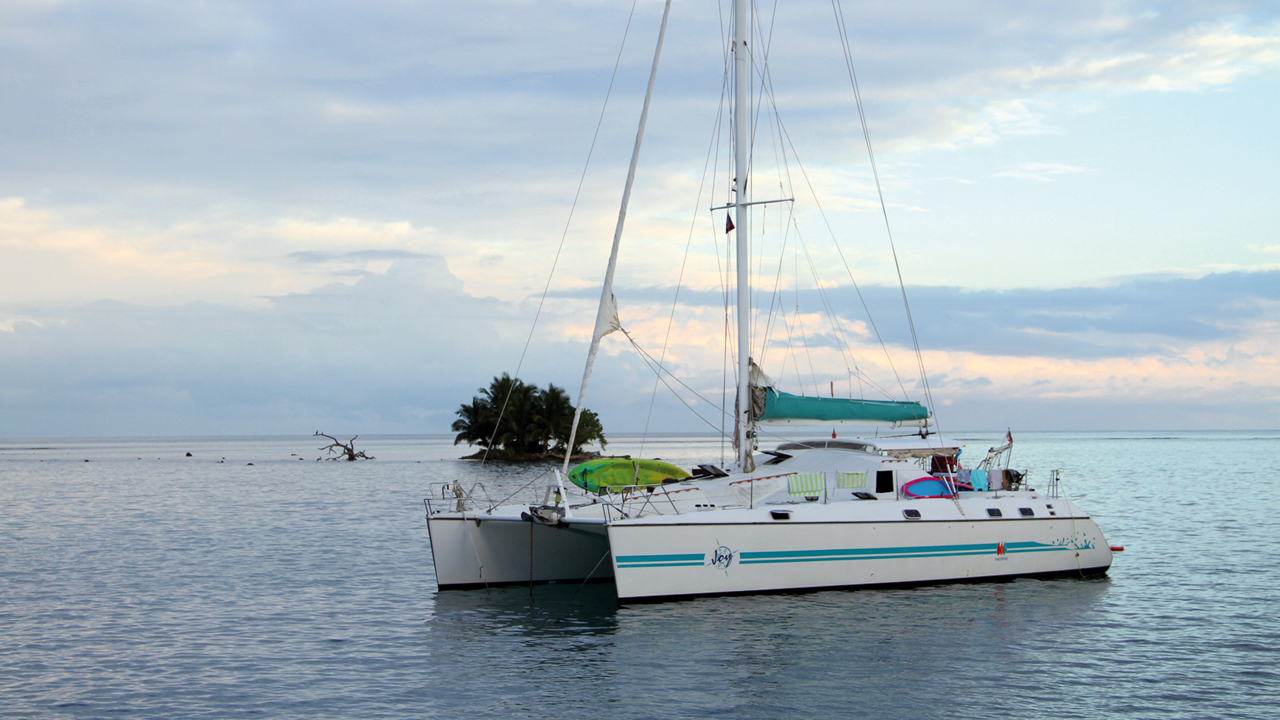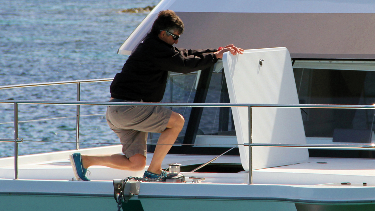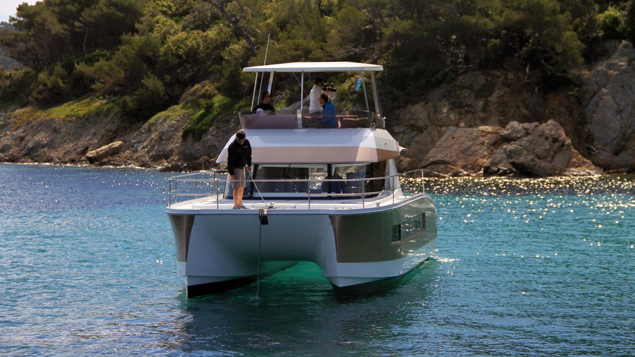 Le franc-bord extérieur d’un catamaran, relativement rectiligne, se prête bien à l’amarrage à couple. La tenue sera évidemment meilleure avec les deux mouillages plutôt qu’un. Mais gare à ne pas les emmêler si le vent tourne.