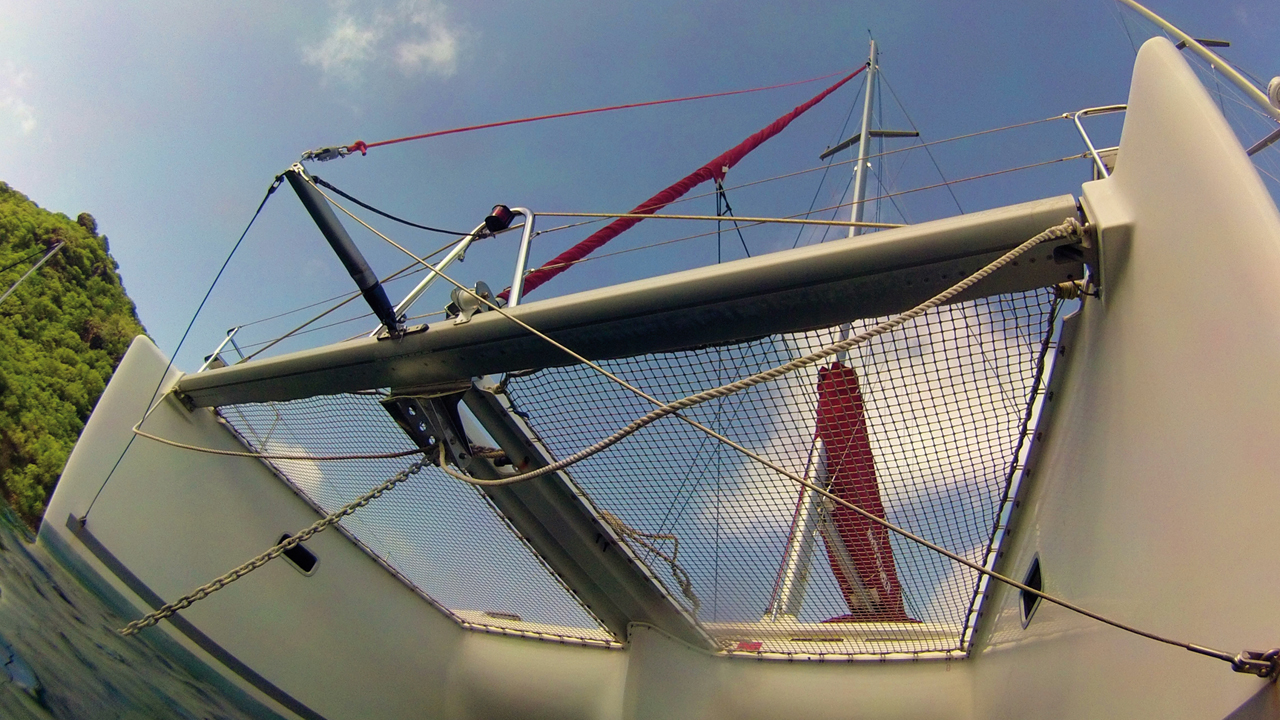 Sur un catamaran, on peut installer une patte d’oie textile. Laquelle présente deux avantages : soulager le guindeau et amortir les coups de rappel d’un mouillage tout chaîne.
