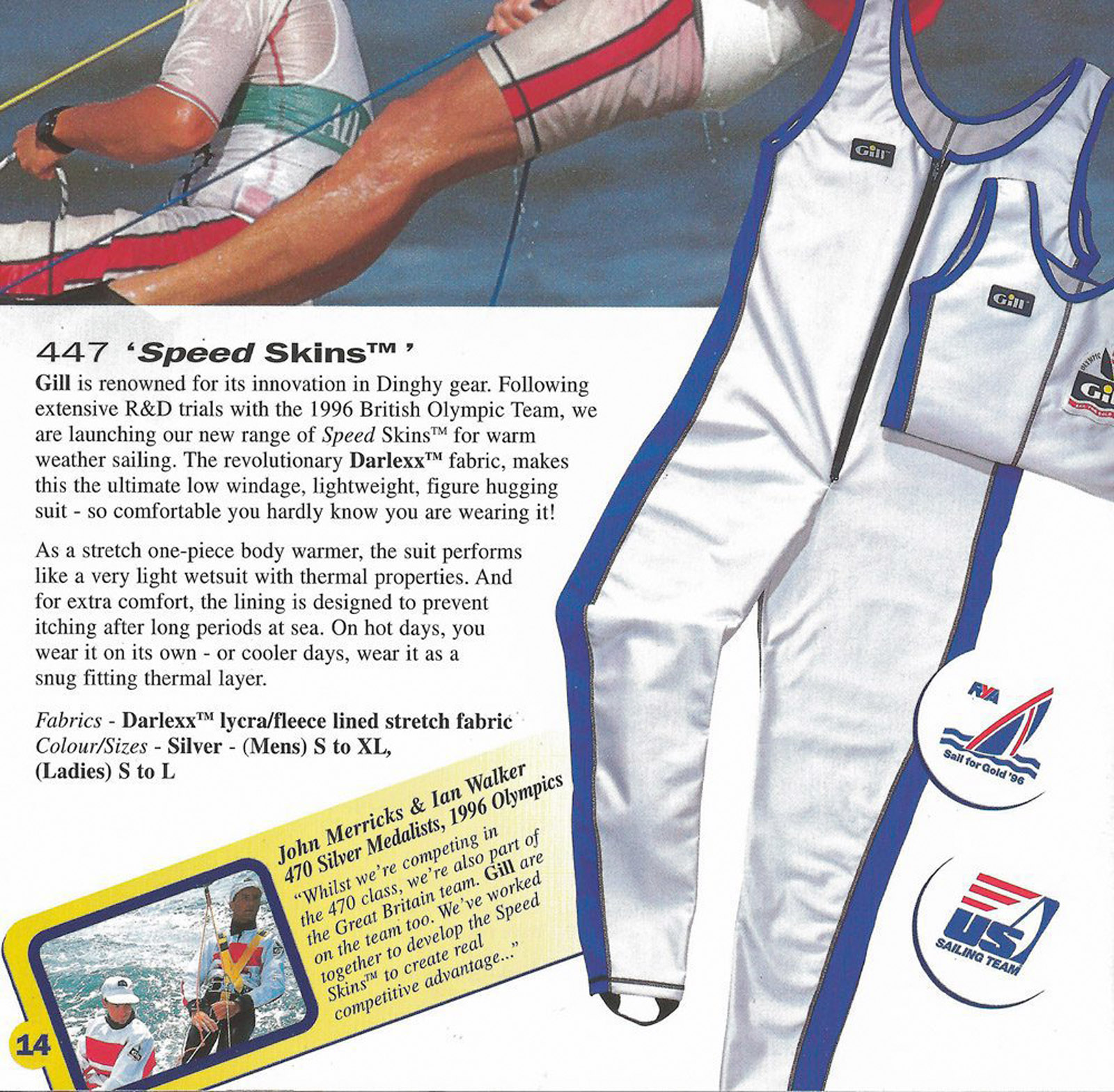 Ces efforts sont reconnus en 1994 avec la nomination de Gill en tant que fournisseur officiel de vêtements pour Team GBR, l’équipe britannique de voile olympique. Ce partenariat va marquer un tournant dans le parcours de la marque en termes de technicité ; un an plus tard, Gill introduction le révolutionnaire Speedskin pour les Jeux Olympiques d’Atlanta, une alternative au néoprène.