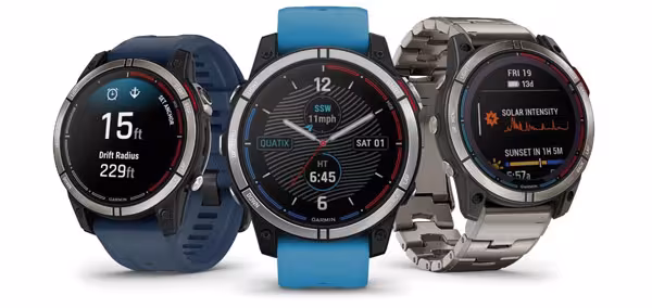 La quatix® 7 peut faire office de télécommande pour les pilotes automatiques Garmin et les systèmes audio Fusion®. Véritable tableau de bord, la quatix® 7 fournit des informations telles que la profondeur de l’eau, le régime du moteur, le vent et bien d’autres données, personnalisables directement depuis la montre. Ces nouveaux modèles sont compatibles avec la cartographie détaillée BlueChart™ g3. Evolution de la quatix® 6, les nouveaux modèles de la série 7 offrent de nouvelles fonctions de navigation telles que le contrôle des écrans multifonctions (MFD), les alarmes de mouillage, et plus encore. Cette nouvelle série intègre des options d’affichage sur un écran tactile couleur qui vient compléter le système à 5 boutons déjà existant. Le modèle Sapphire est doté d’un nouvel écran AMOLED haute définition. Les modèles Solar, quant à eux, captent l’énergie solaire pour prolonger l’autonomie de la batterie – jusqu’à 37 jours en mode montre connectée, et jusqu’à 90 jours en mode économie d’énergie