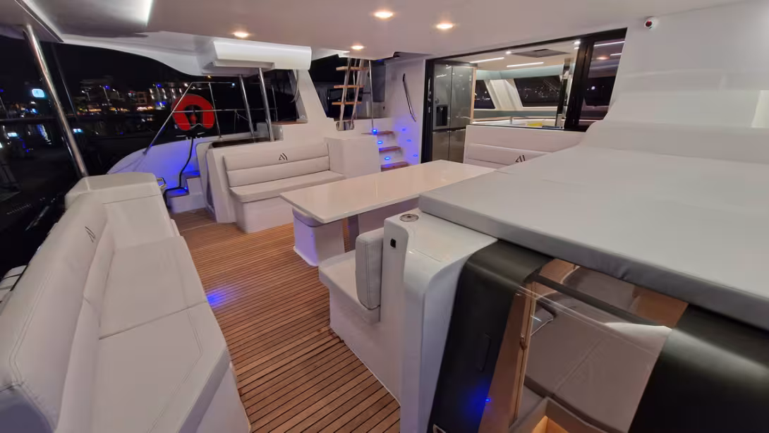 Le remplaçant de l’Aventura 44, toujours signé Lasta Design, présente de nombreuses innovations, à commencer par la possibilité d’offrir jusqu’à six cabines et quatre salles de bains grâce à des descentes aménagées dans le cockpit. En version quatre cabines, tous les couchages sont installés perpendiculairement à la marche. Ce catamaran au design moderne propose également un demi-flybridge sur tribord et un poste de barre à mi-hauteur, précédé par un poste de manœuvre sur le rouf.