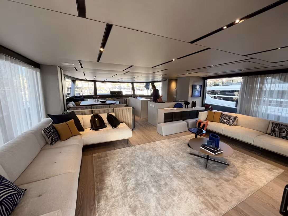 Le BGM75 se veut cohérent avec l’offre du groupe : la largeur est donc réduite, au point de se rapprocher d’un gabarit monocoque, et surtout, seules les vues de face dévoilent les deux coques. De profil et surtout de l’arrière, le Bluegame reprend les codes de design d’un yacht monocoque. L’idée est donc de gagner en stabilité, et surtout d’économiser du carburant : le bureau d’études annonce en effet une consommation réduite de 40 % comparée à celle d’un yacht monocoque de 90 pieds – on parle tout de même, pour une base de 300 heures d’utilisation, d’un gain de 66 000 litres de gazole, soit 175 t de CO2 émis. La structure monobloc permet de loger une largeur maxi à l’avant – de quoi loger une magnifique suite Propriétaire.