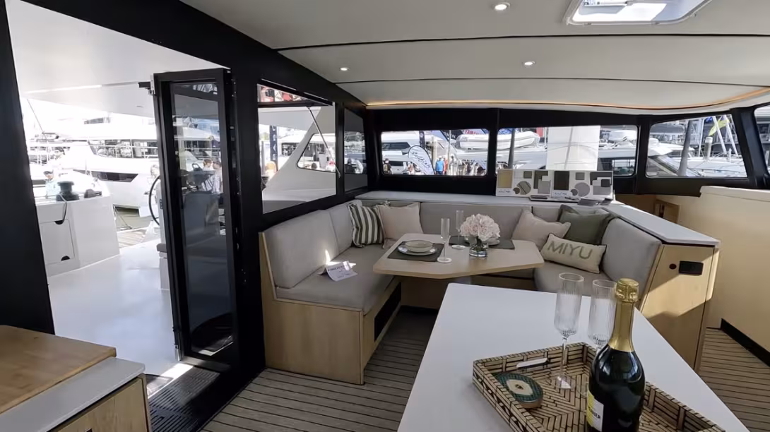 De fait, le Cure 55 #1, décliné en version Performance, est un catamaran affûté tout carbone qui exploite au mieux sa structure monobloc pour tenir un devis de poids à peine supérieur à 9 t. Les coques angulées à 2,5° comme les anciens Catana arborent des entrées d’eau très fines, des étraves légèrement inversées et des dérives sabres. Le gréement Hall Spars est évidemment lui aussi en carbone, tout comme la bôme Park Avenue positionnée à ras du rouf. Le résultat ? Le Cure 55 atteint les 20 nœuds avec une facilité déconcertante…