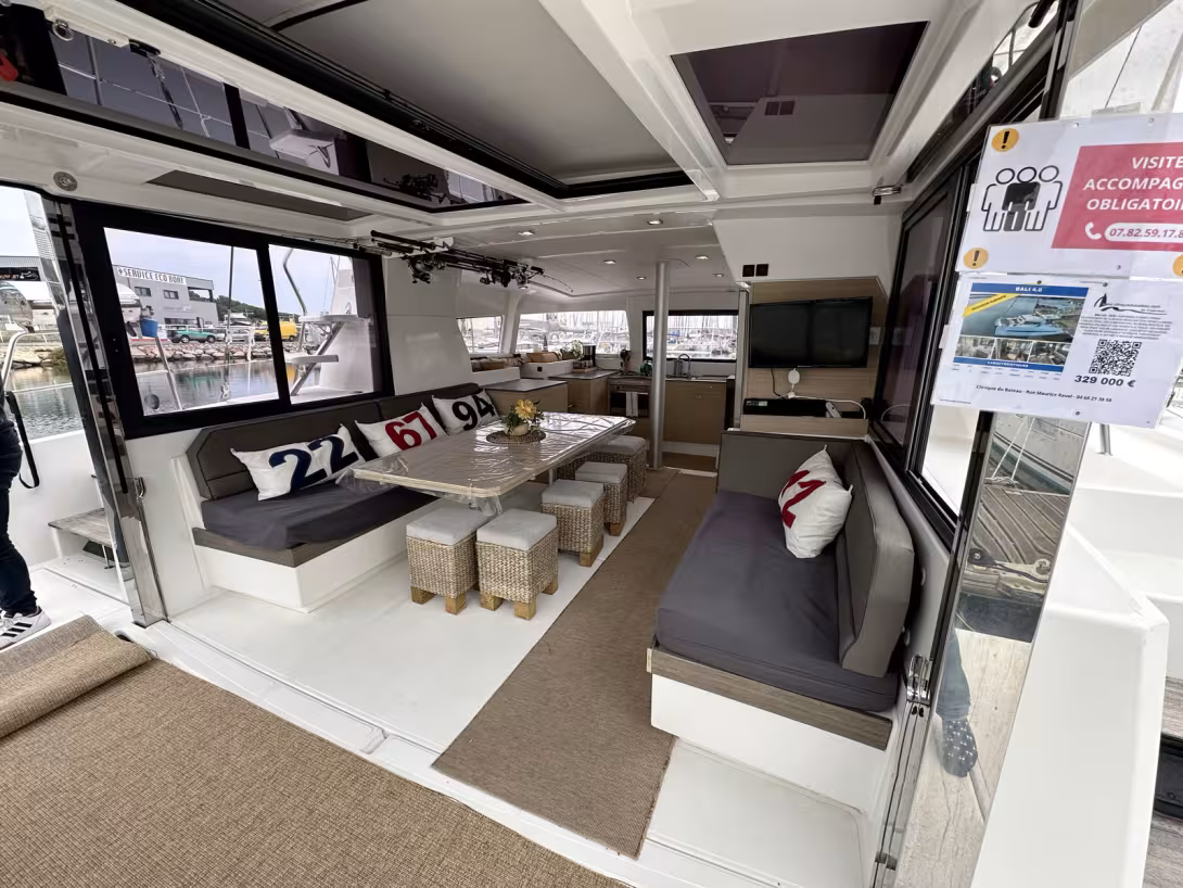 Lancé en 2015, le 4.0 est longtemps resté le plus petit des Bali… pour autant, ce catamaran se révèle un véritable "passe-muraille" : le carré recule grâce à la porte basculante, ouvrant la salle à manger 8 personnes vers l’extérieur, tandis que les baies ouvrantes – frontale et latérales – donnent l’impression de profiter d’un multicoque beaucoup plus grand. Cockpit avant, plateforme arrière, flybridge : le confort est optimum – même si l’unité que nous vous présentons ici est forcément un peu défraîchie du côté de la sellerie après 10 ans d’usage. Ce modèle est en revanche équipé de deux Nanni de 40 ch – et non pas les blocs de 20 ch proposés en standard – et il est très bien équipé.