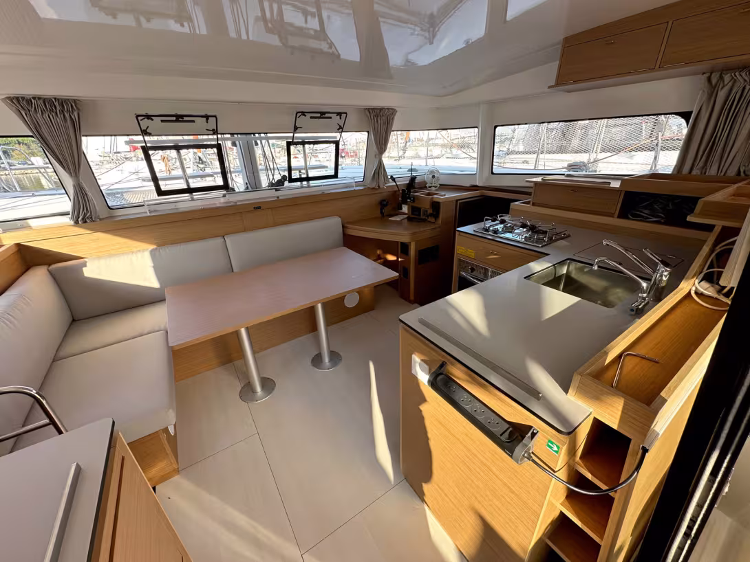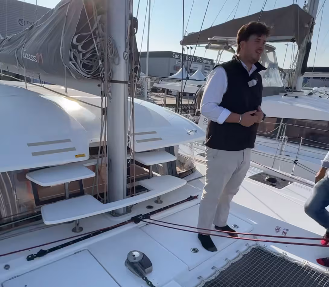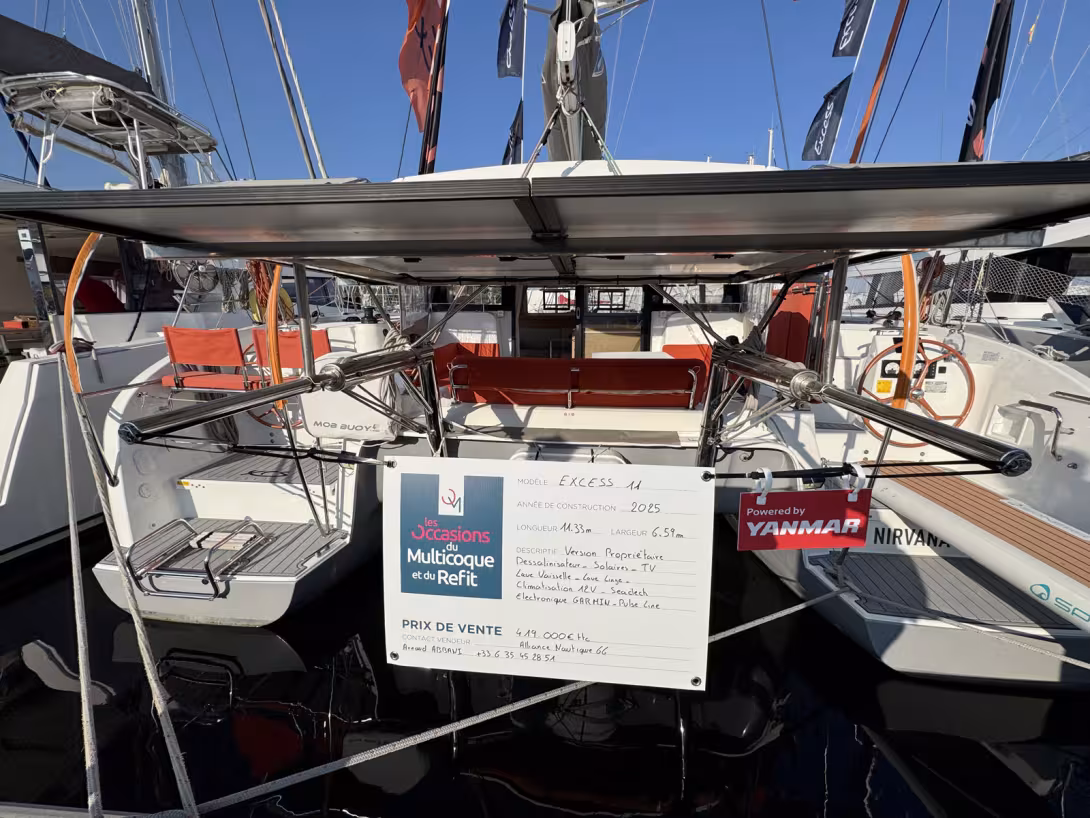 Doit-on vous (re)présenter le plus petit des Excess 11 ? Ce modèle, lancé début 2020, est le premier à s'affranchir à 100% de l'outillage Lagoon et il a connu un très grand succès - c'est aujourd'hui le best-seller de la marque avec près de 300 exemplaires construits. Ce catamaran compact et accessible séduit particulièrement les nouveaux arrivants dans le monde de la croisière. L'Excess 11 se révèle en effet très facile à mener et offre pour sa taille un confort étonnant. Le modèle que nous vous présentons ici est presque neuf puisqu'il a été mis à l'eau en 2024. Il s'agit d'une version Propriétaire trois cabines très bien équipé et autonome sur le plan de l'énergie ; ce modèle présente des petites touches custom comme les logos XCS imprimés sur le revêtement de pont et au-dessus de l'entrée de la nacelle mais ne propose pas le génois à recouvrement désormais disponible - on se contente du foc autovireur.
